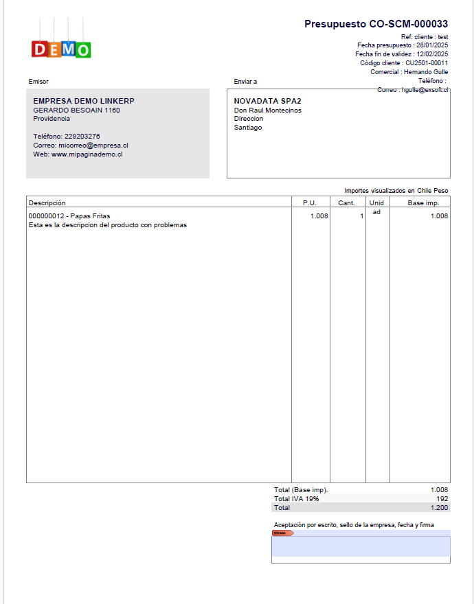 Validez de oferta, notas y adjuntos comerciales.